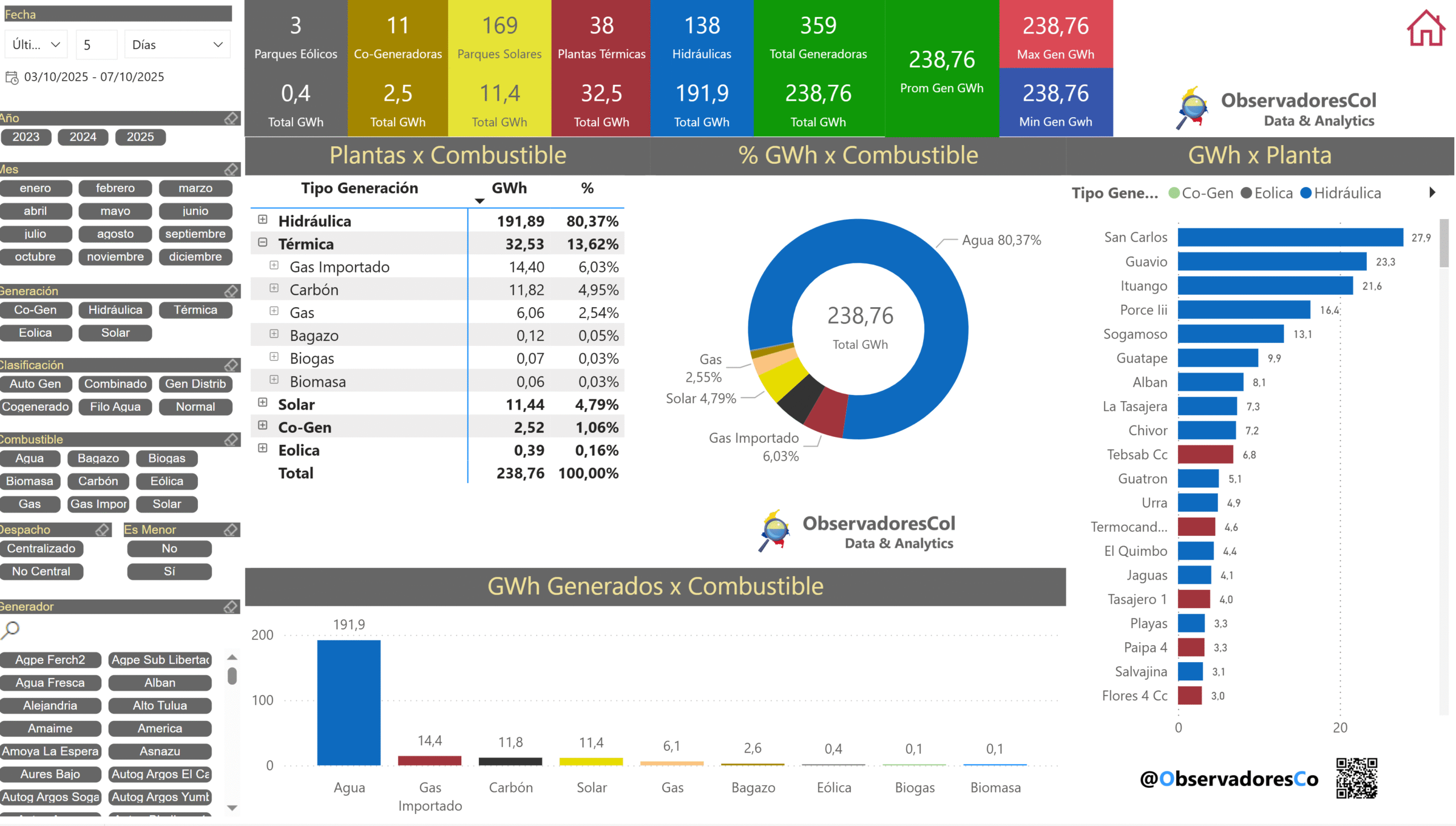 Desde el mes de Marzo 2025 en Colombia se está generando energía con hidroeléctricas entre un 80 y 83%, Principalmente por 138 plantas que producen 192 GWh, las plantas que producen más energía hidráulica son: San Carlos, Guavio e Ituango