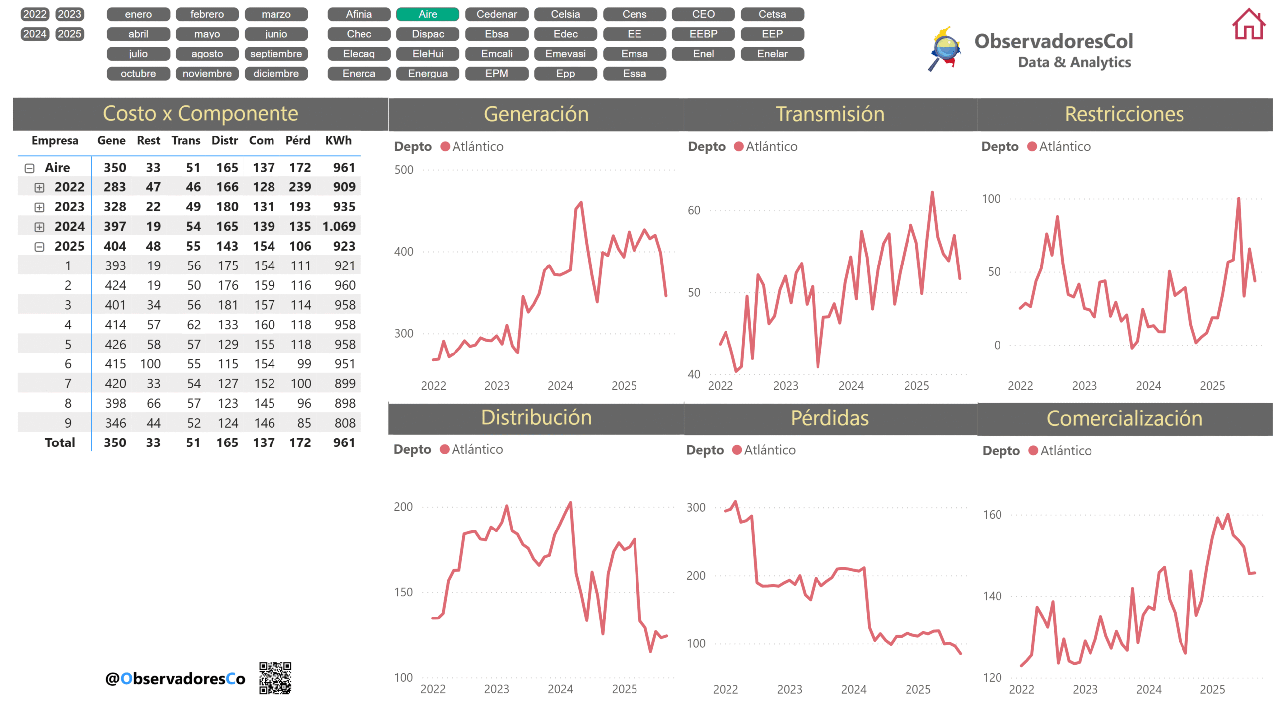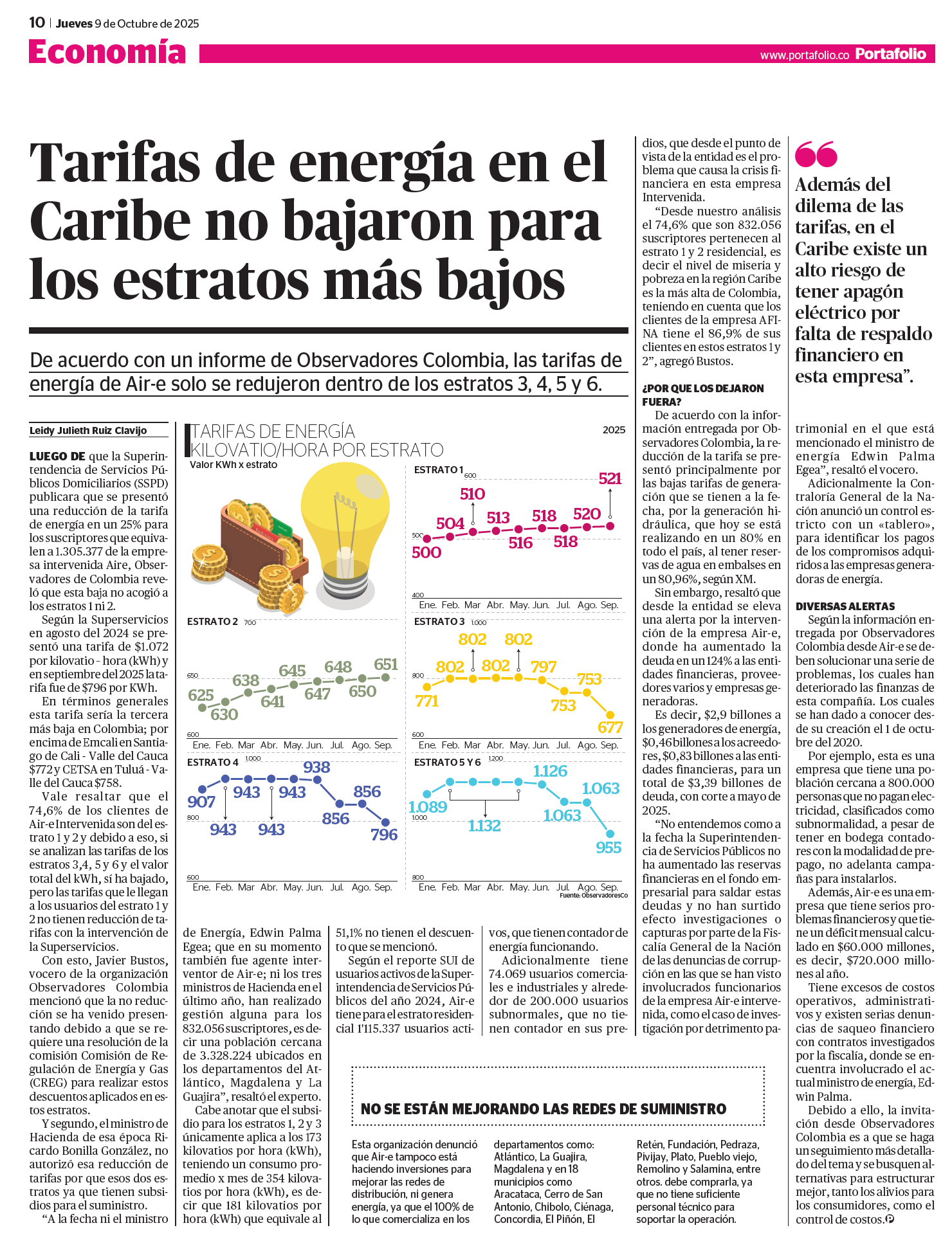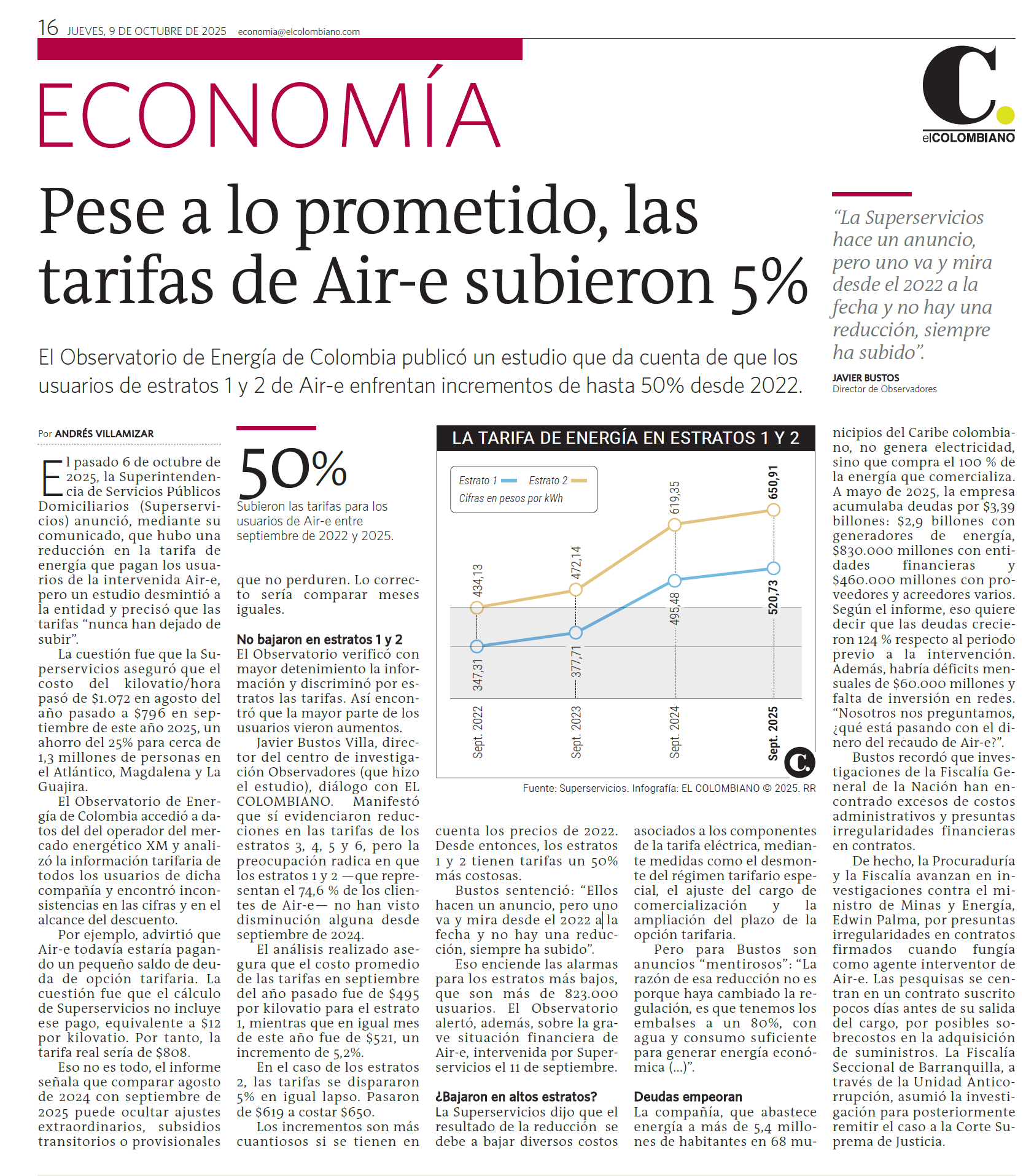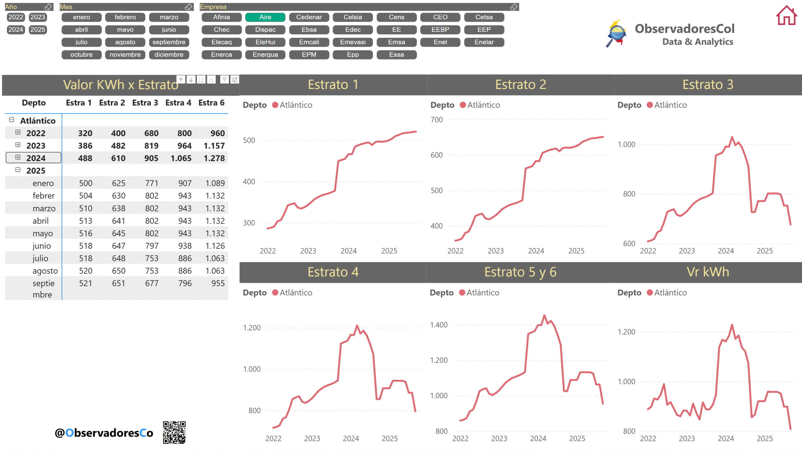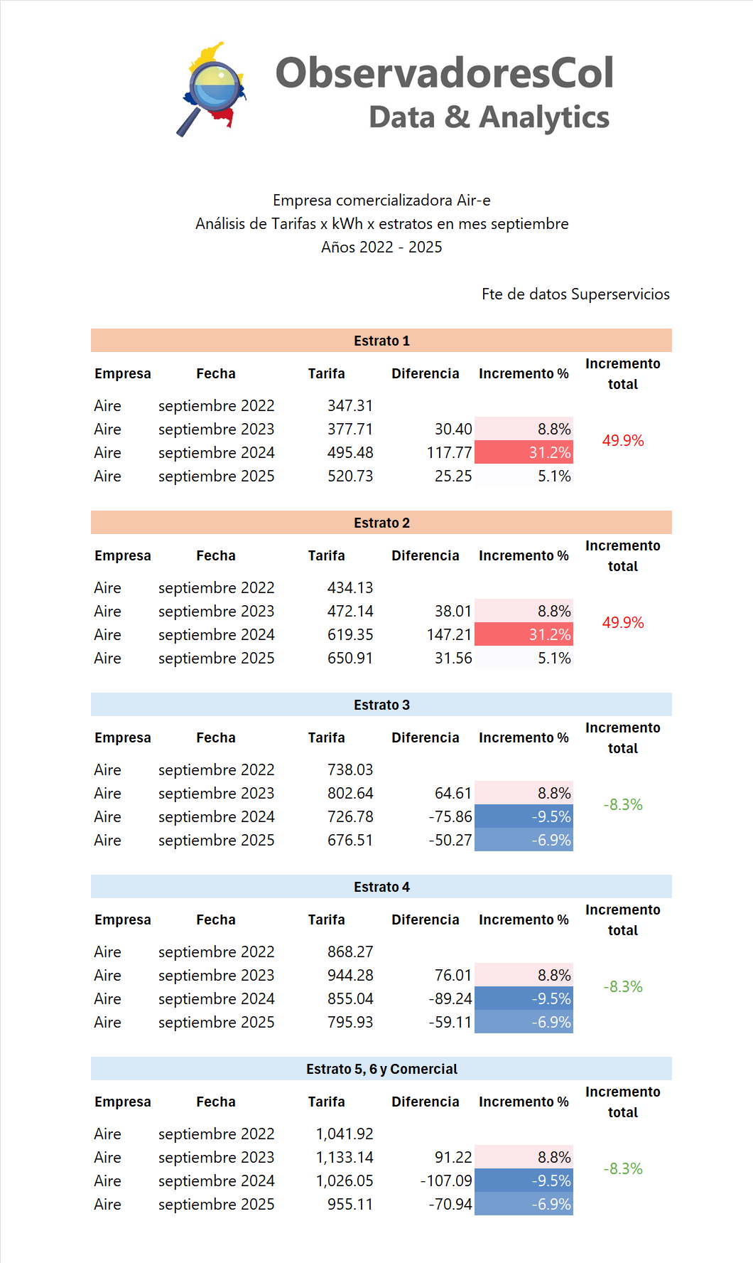 El día 6 Octubre 2025, la Superintendencia de Servicios públicos domiciliarios, publica el comunicado 42 donde anuncia la reducción de la tarifa de energía en un 25% para los suscriptores (1´305.377) de la empresa intervenida Air-e , donde registra la tarifa $1.072 por kWh en Agosto 2024; versus la tarifa $796 por kWh en Septiembre 2025, esta tarifa sería la tercera (3ra) más baja en Colombia; por encima de Emcali en Santiago de Cali – Valle del Cauca $772 y CETSA en Tulua – Valle del Cauca $758