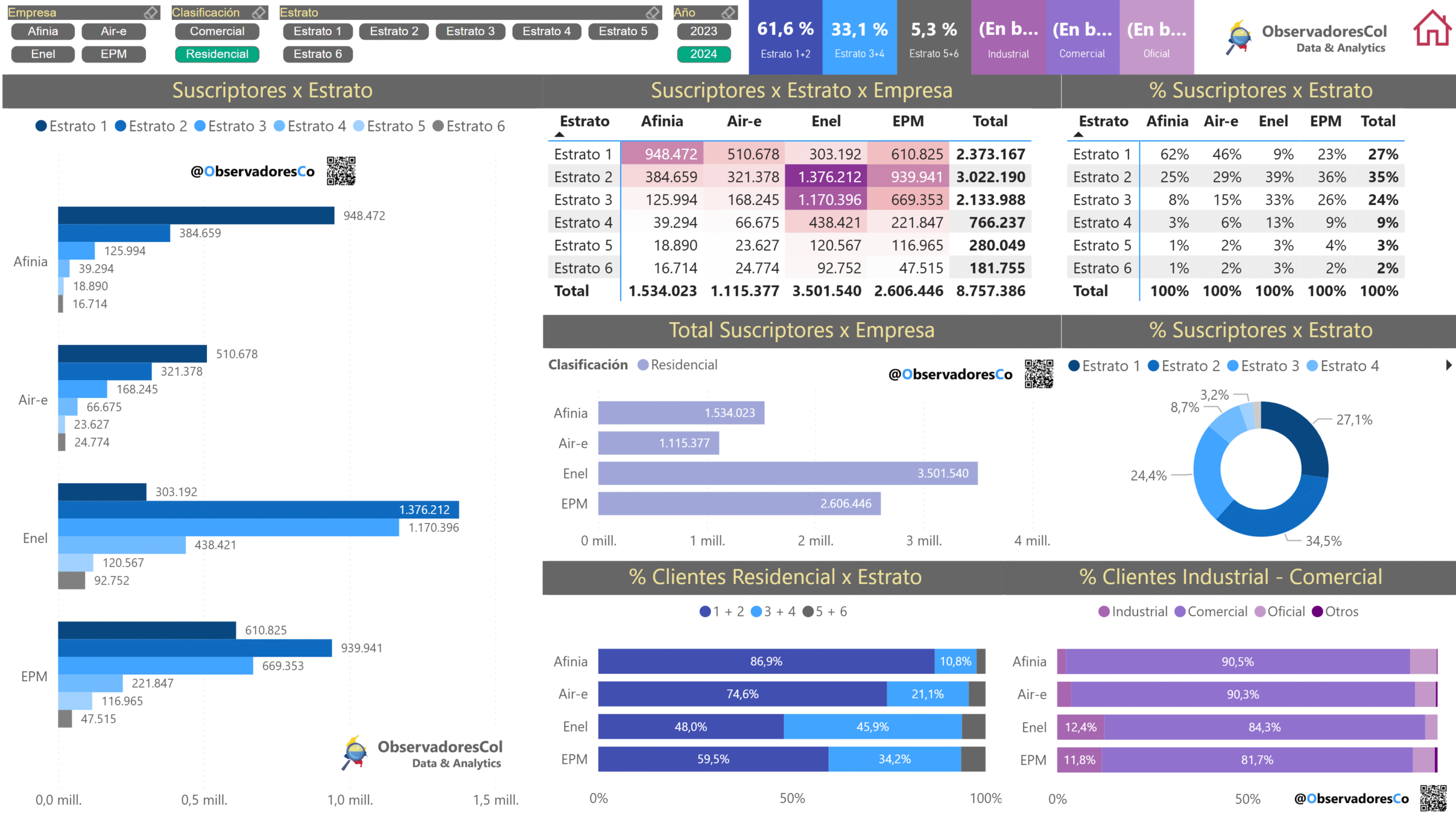 Analizando la caracterización de los suscriptores de la empresa Air-e ESP, el 74.6% son 832.056 suscriptores, que pertenecen al estrato 1 y 2 residencial, es decir el nivel de pobreza en la región Caribe, es la más alta de Colombia; mientras que los clientes de la empresa AFINA ESP el 86.9% de sus suscriptores pertenecen a los estratos 1 y 2.